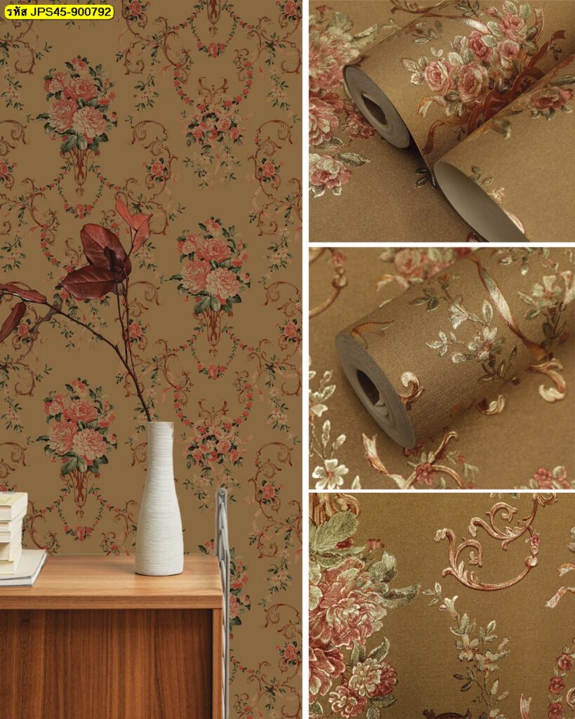 ชื่อสินค้า : วอลเปเปอร์ติดผนังลายช่อดอกไม้ สีน้ำตาลทอง