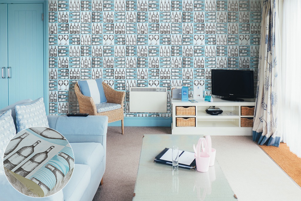 คุณสมบัติของวอลเปเปอร์ : วอลเปเปอร์ติดผนังลวดลายภาพวาดขวดเครื่องดื่ม และแก้ว จัดเรียงสลับไปมาจนเป็นลวดลาย ที่สวยงาม ประกอบด้วยพื้นหลังสีฟ้าอ่อน สลับสีฟ้าเข้ม ทำให้ลวดลายมีสีสัน สดใส และน่าค้นหาเพิ่มขึ้น ซึ่งสามารถนำไปใช้ตกแต่งผนังห้องได้ทุกๆมุมห้อง ไม่ว่าจะตกแต่งบ้าน หรือร้านค้า ก็สามารถนำไปตกแต่งได้ตามสไตล์ที่ชื่นชอบ