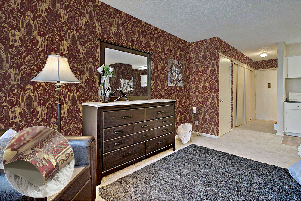 คุณสมบัติของวอลเปเปอร์ : แต่งผนังบ้านให้มีสีสัน สดใส และแปลกใหม่ ด้วยวอลเปเปอร์ติดผนังลวดลายช้าง ผสมผสานกับลวดลายดอกไม้ไขว้ไปมา พื้นหลังสีแดงเข้ม มีความสวยเงางามกับลวดลาย สามารถนำไปตกแต่งผนังห้องสไตล์ย้อนยุค เพื่อช่วยสร้างบรรยากาศได้อย่างลงตัว