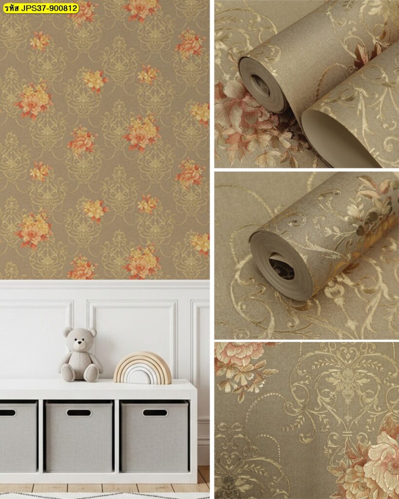 ชื่อสินค้า : วอลเปเปอร์ติดผนังลายหลุยส์ดอกไม้ สีน้ำตาลพื้นเทาปนทอง