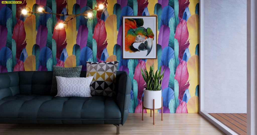 วอลเปเปอร์ลายขนนกช่วยสร้างความโดดเด่นให้กับผนังห้องนั่งเล่น ที่สื่อถึงสีสันและความสดใสเป็นอีกหนึ่งสไตล์ที่ไม่ซ้ำใคร