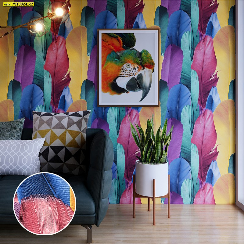 ชื่อสินค้า : วอลเปเปอร์ติดผนังลายขนนกสีเขียวส้มน้ำเงิน