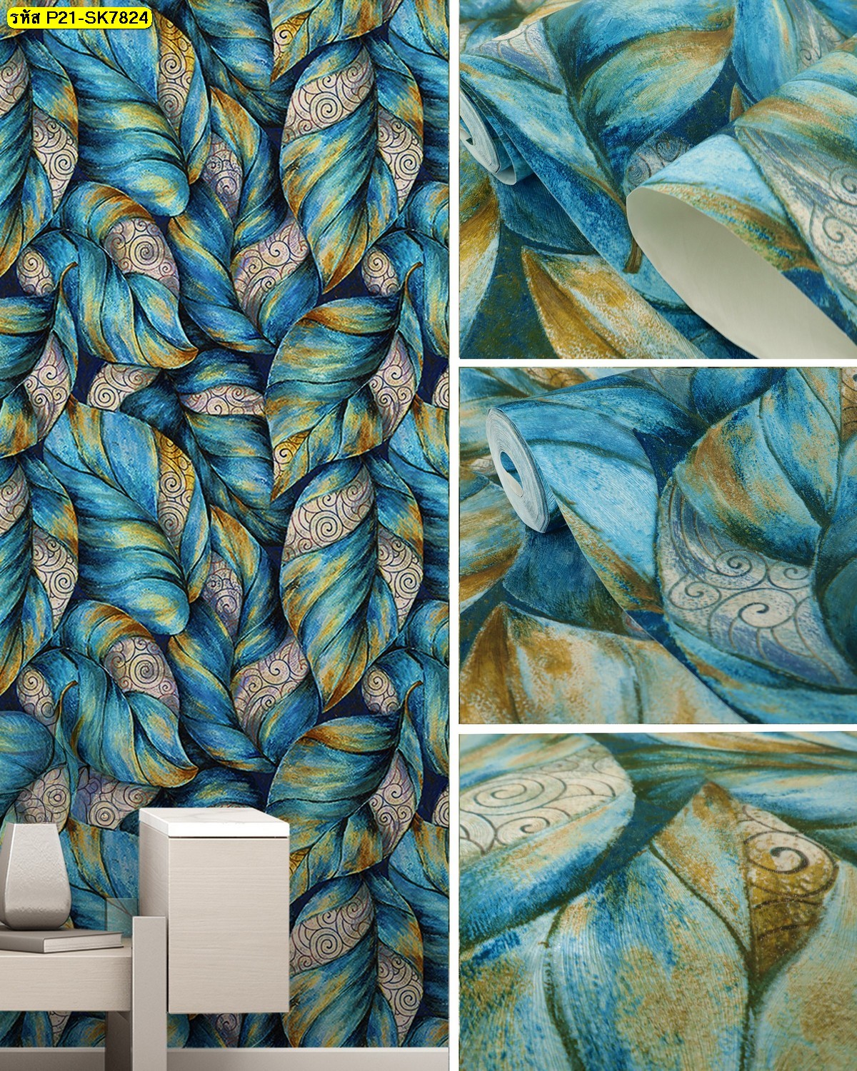 ชื่อสินค้า : วอลเปเปอร์ติดผนังลายใบไม้สีฟ้า