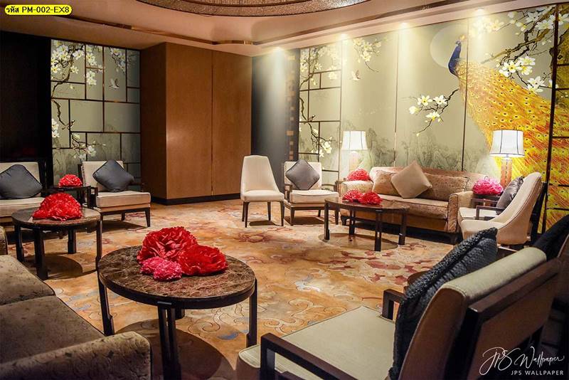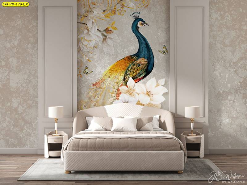 ภาพฮวงจุ้ยวอลเปเปอร์ลายนกยูงกลับพื้นหลัง สีทองอร่าม ติดตั้งตรงไหนก็ต้องเหลียวชม
