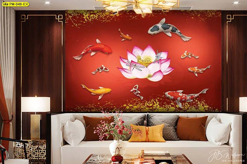 ภาพวอลเปเปอร์ปลาคราฟ รอบดอกบัว แต่งในห้องแบบจีน ดูโดดเด่น