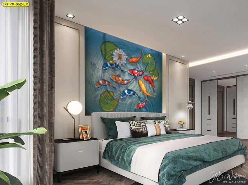 ออกแบบตกแต่งห้องนอน ให้สวยด้วยวอลล์สีน้ำเงินลายปลาคราฟว่ายน้ำ