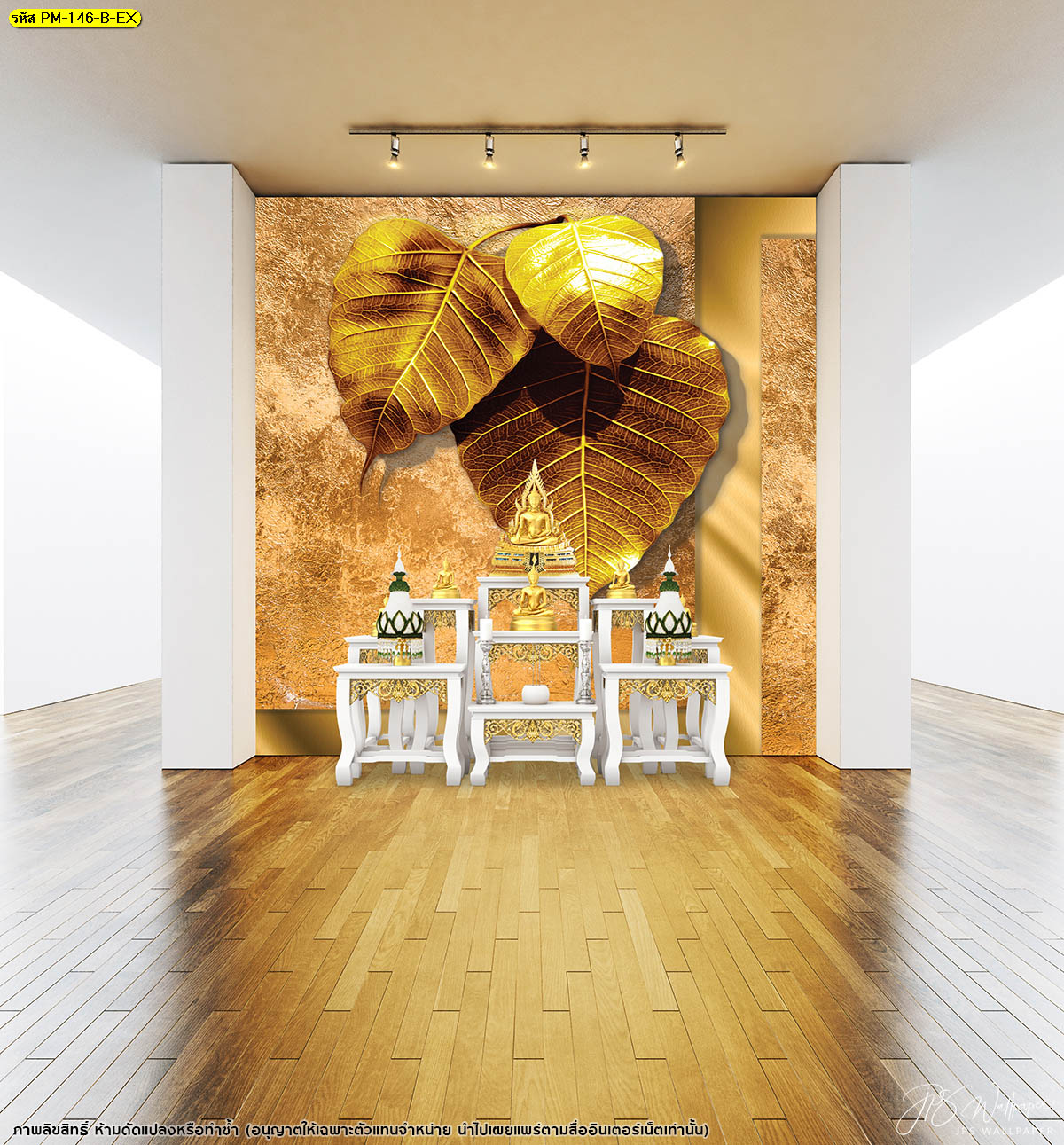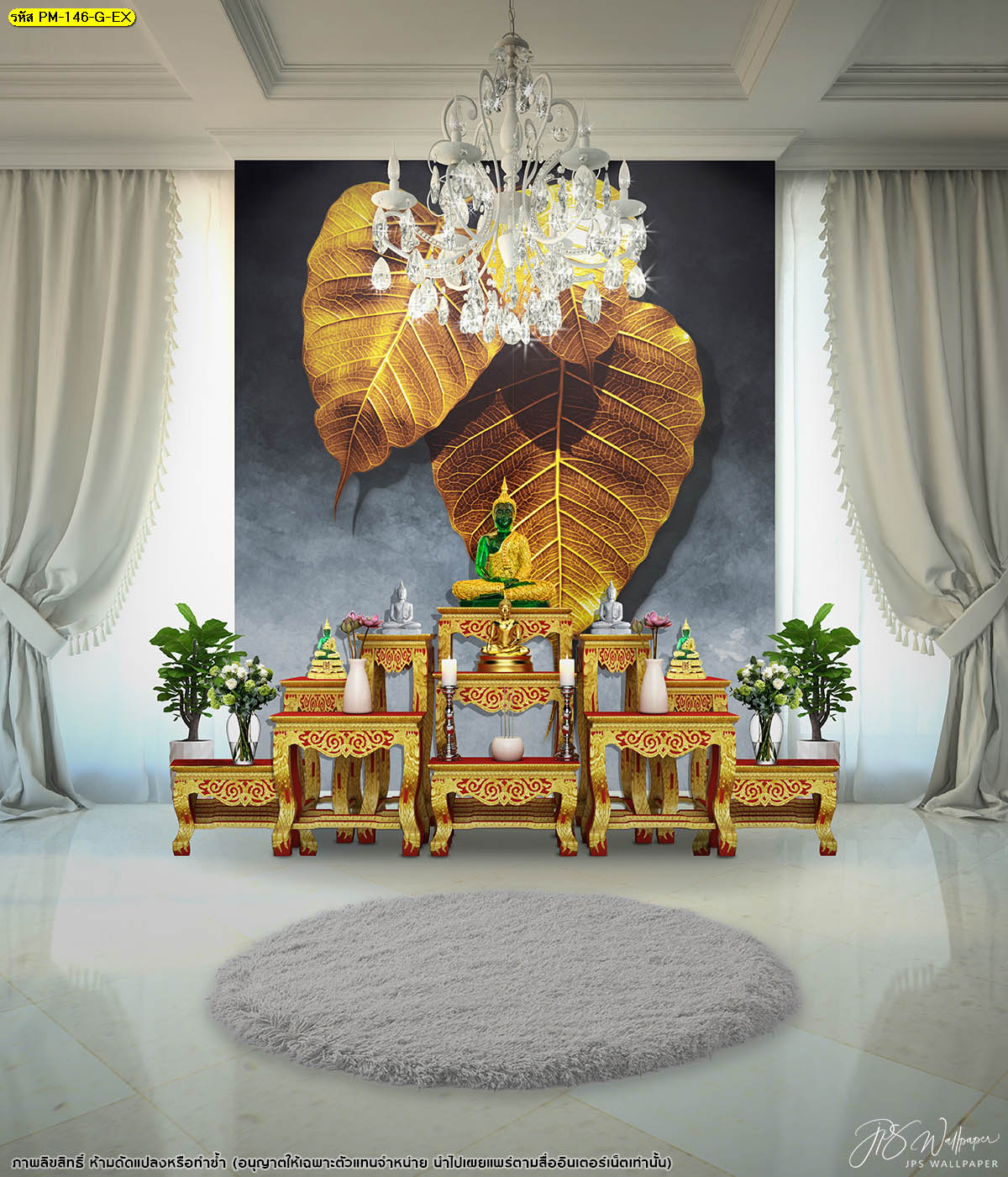 สัมผัสความหรูหราในห้องพระที่ตกแต่งกรุผนังรอบห้อง พร้อมติดวอลเปเปอร์ใบโพธิ์สวยงามโดดเด่น