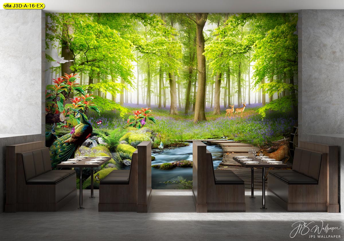 ผนังร้านอาหารตกแต่งลายป่าไม้สีเขียว สดชื่น