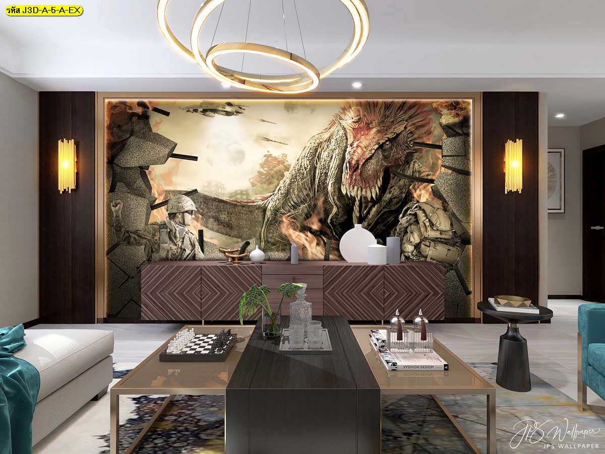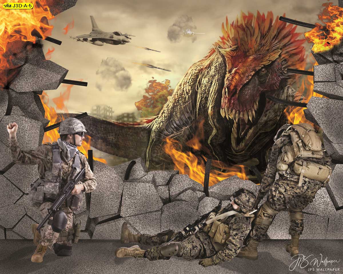วอลเปเปอร์สามมิติลายนักรบกับไดโนเสาร์โทนสีเข้ม