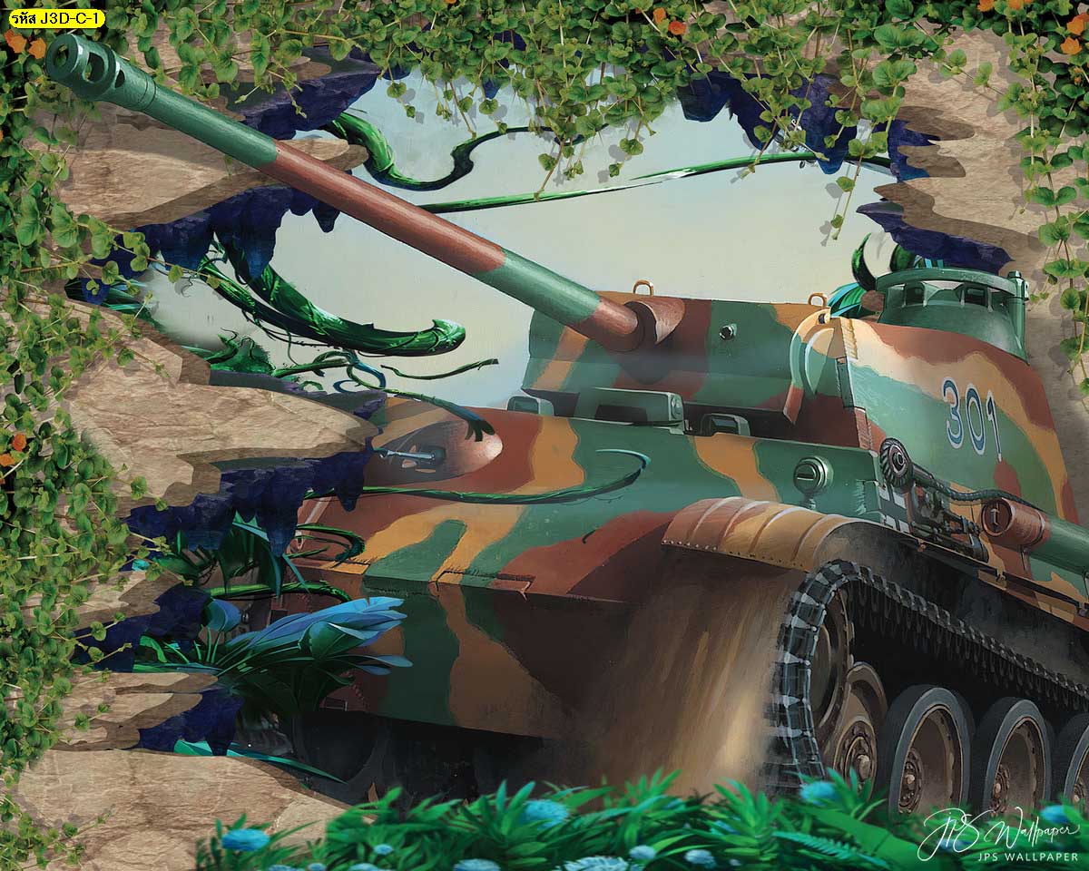 วอลเปเปอร์สามมิติลายทหารบนรถถังโทนสีเขียว