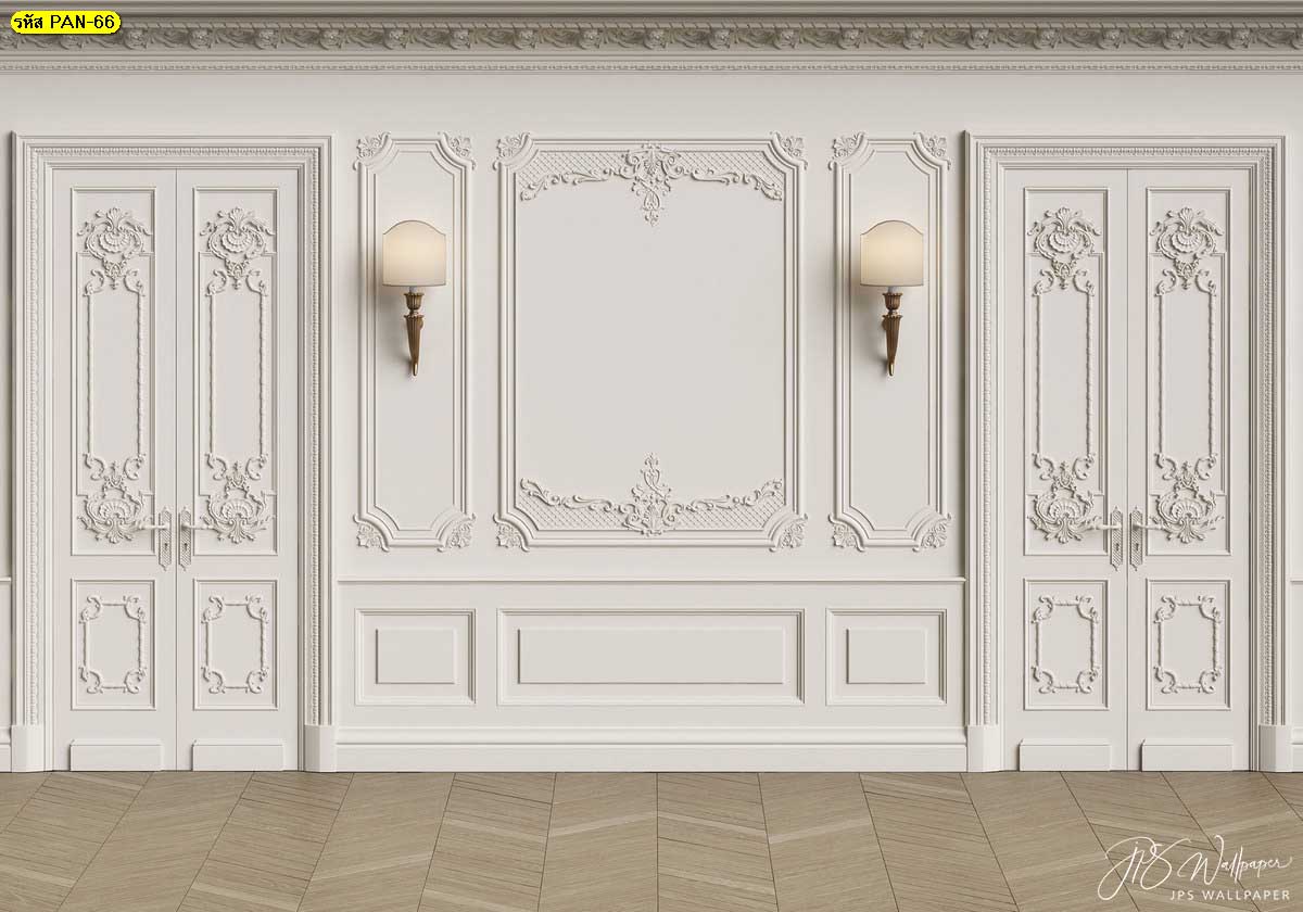 วอลเปเปอร์ลายกรุผนังและประตูสีขาวตกแต่งคิ้วหลุยส์