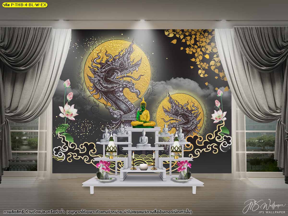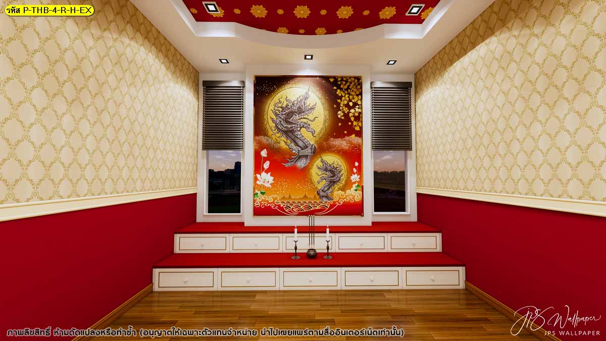 ฉากหลังห้องพระตกแต่งวอลเปเปอร์ลายไทยพญานาค สวยงาม โดดเด่น