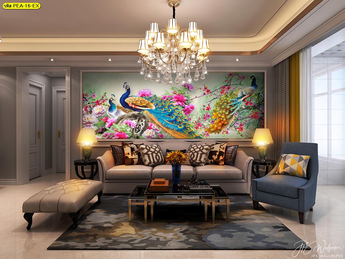 วอลเปเปอร์นกยูงสามมิติ ตกแต่งห้องนั่งเล่นในแบบสไตล์จีนสวยงาม