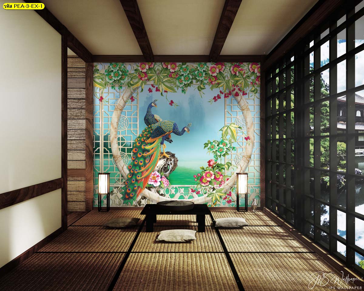 วอลเปเปอร์ติดผนังในห้องลายนกยูง สีสวย สบายตา