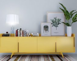 ตกแต่งห้องนั่งเล่นให้ทันสมัยสไตล์โมเดิร์นด้วยวอลเปเปอร์ติดผนังลายเรียบสีเทาปนฟ้าผสานเข้ากับพรมปูพื้นสีทึบและเติมความโดดเด่นด้วยสีเหลืองของโซฟาได้อย่างลงตัว