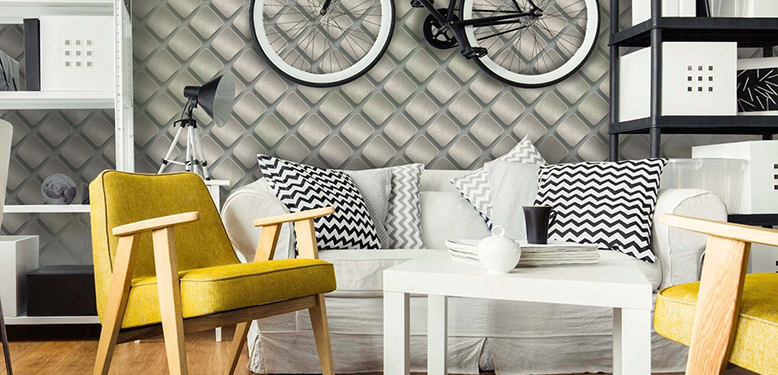 เปลี่ยนมุมมองเดิมๆ ให้มีสีสันที่สดใส ด้วยวอลเปเปอร์ลายกราฟิก รูปทรงสี่เหลี่ยม สีขาวครีม พื้นหลังสีเทาอ่อน ตกแต่งผนังภายในห้อง ช่วยเพิ่มความสว่าง