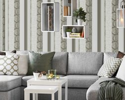 วอลเปเปอร์ติดผนังลายทางลายวงกลมสีเทาเข้ม สไตล์โมเดิร์น การตกแต่งในสไตล์นี้ก็เป็นที่นิยมกันมากและมีสีสันที่ให้ทั้งความโมเดิร์นสบายตา