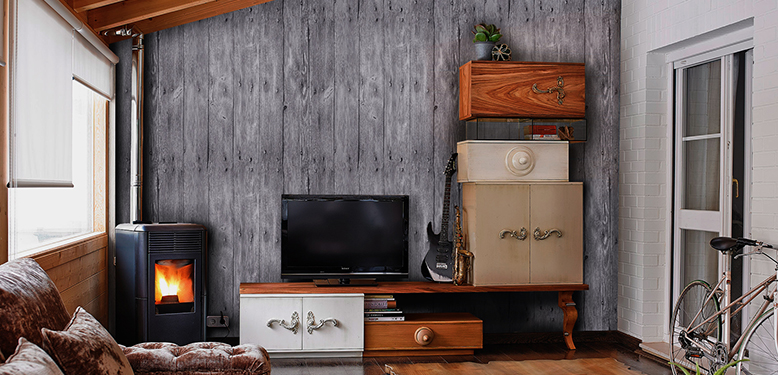 ตกแต่งผนังห้องสวยๆ แบบ Classic ด้วยวอลเปเปอร์ลายไม้เก่า สีเทา ที่ให้ความรู้สึกอบอุ่น ตกแต่งให้เข้ากับเฟอร์นิเจอร์ภายในห้อง ได้หลายแนวทาง