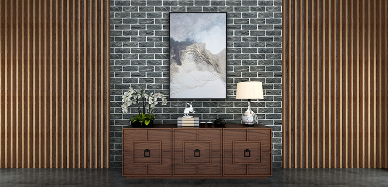 ตกแต่งผนังภายในลวดลายอิฐบล็อค สีเทา ปนสีดำ เปรียบเสมือนลวดลายก้อนอิฐจริง ลวดลายคมชัด สวยงาม ช่วยเนรมิตรสไตล์ห้องให้มีกลิ่นอายความเป็นลอฟท์