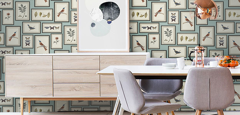 วอลเปเปอร์ติดผนังลวดลายกรอบรูป ลายสัตว์น่ารัก ลายใบไม้ กับพื้นหลังสีเขียวอ่อนเบาๆ ตกแต่งห้องสาวๆ ที่ต้องการความน่ารักสดใส ความหวานหอม และดูอบอุ่น