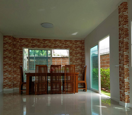 ผลงานติดตั้งวอลเปเปอร์ลายอิฐ สีส้ม สไตล์ธรรมชาติ โดย ม่านสยามดีไซน์ ย่านหนองจอก มีนบุรี
