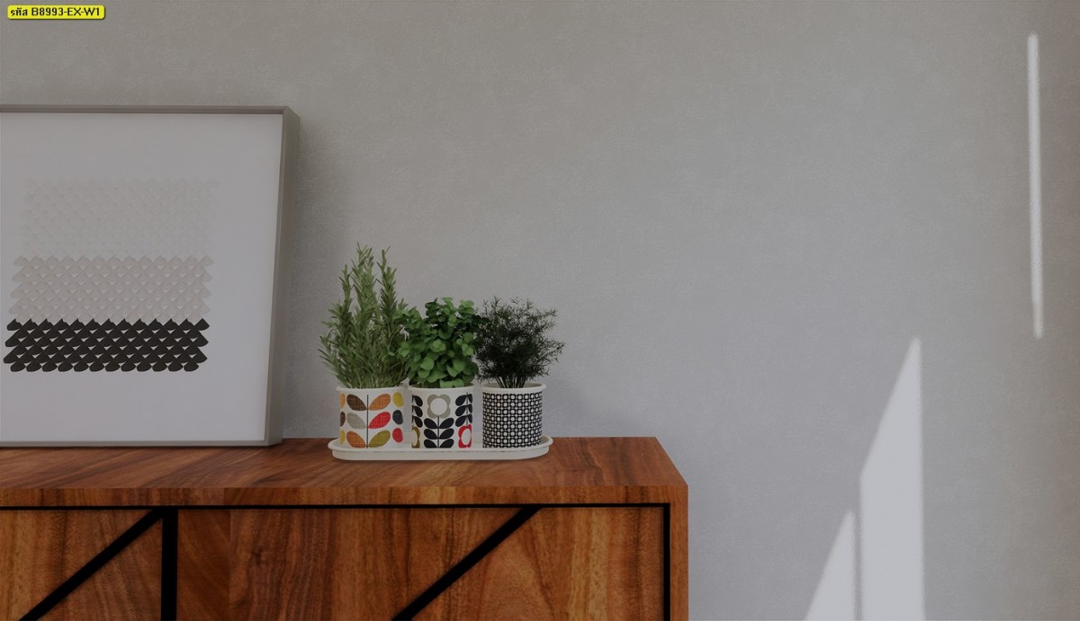 เปลี่ยนผนังเรียบๆให้มีสไตล์ด้วยวอลเปเปอร์ติดผนังสีฟ้าขาว เพิ่มเสน่ห์สไตล์โมเดิร์นด้วยของตกแต่งและเฟอร์นิเจอร์รูปแบบต่างๆ เช่น ไม้ประดับสีเขียวติดผนังและโต๊ะทำงานสีเทา